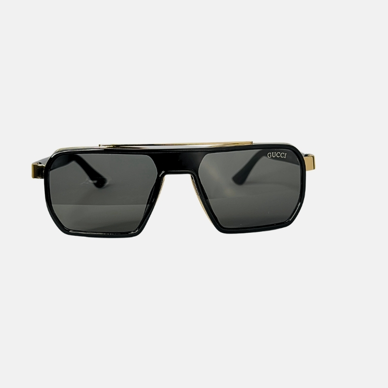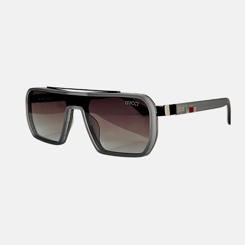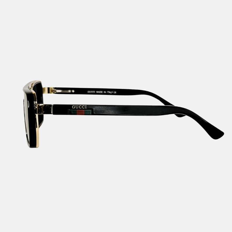 Signature Gucci Branding: Highlighted by the iconic gold-tone logo and the classic green and red web stripe on the temples.